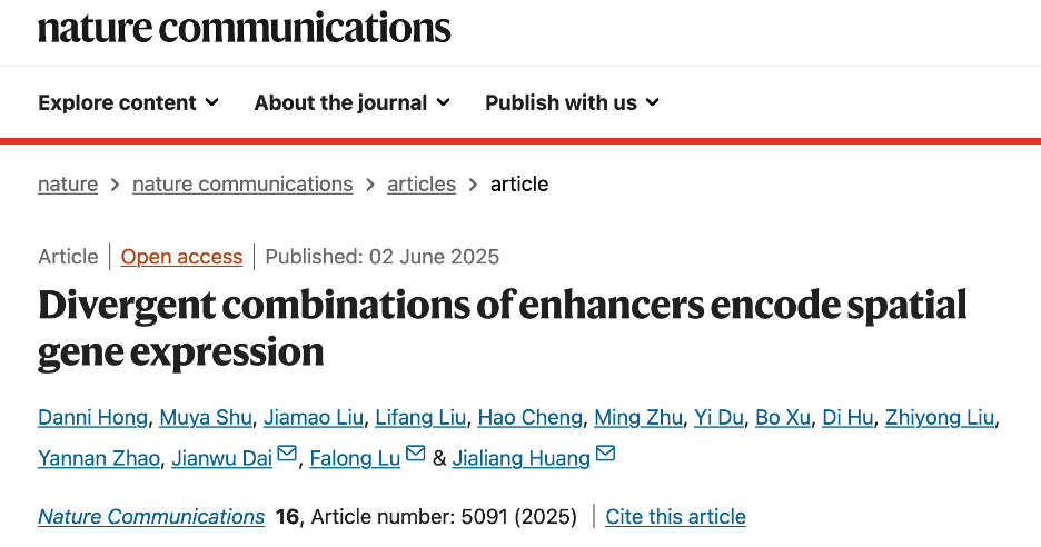 2025年6月2日,我院黄佳良教授团队和中国科学院遗传与发育生物学研究所陆发隆团队、戴建武团队合作在Nature Communications上发表了题为“Divergent combinations of enhancers encode spatial gene expression”的研究论文,该研究开发了eSpatial算法,通过整合空间基因表达和染色质可及性等多组学数据,系统揭示了不同增强子组合调控了空间特异性基因表达。