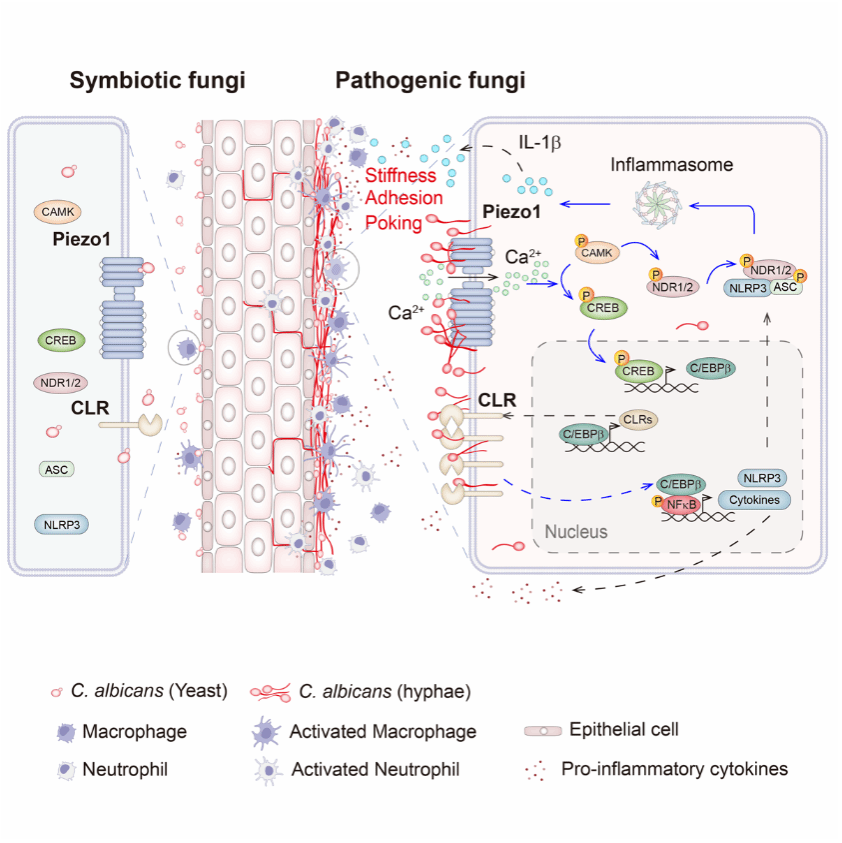 该项研究发现菌丝型C. albicans的刚度、硬度和黏着性显著高于酵母型;固有免疫细胞可以通过机械力受体Piezo1感知菌丝型C. albicans,从而启动天然免疫应答,抑制并清除致病性C. albicans。机制上,刚性菌丝型C. albicans激活Piezo1,触发钙离子/CaMKs/CREB信号通路,上调转录因子C/EBPb,促进模式识别受体CLRs表达和激活;进一步研究还发现Piezo1/CaMKs通路通过激活Hippo通路核心激酶NDR1/2,增强NLRP3炎症小体组装,加剧菌丝型真菌诱导的炎症反应;Piezo1敲除或NDR1/2敲除小鼠对菌丝型C. albicans感染的清除能力都显著减弱。该项研究揭示了C. albicans形态转换与机体启动免疫应答的新机制,表明Piezo1作为机械敏感受体在真菌感染免疫防御中的重要作用,为靶向免疫力学调控的感染和炎症治疗提供了新思路。