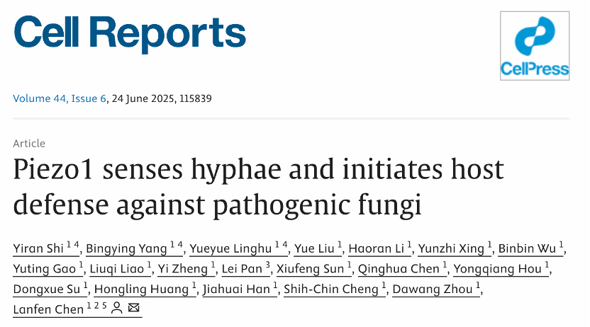 2025年6月16日,我院陈兰芬教授研究团队在Cell Reports上发表了题为“Piezo1 senses hyphae and initiates host defense against pathogenic fungi”的研究论文,该工作揭示了机械敏感性离子通道Piezo1选择性感应菌丝型致病真菌,从而激活Hippo通路重要激酶NDR1/2,增强NLRP3炎症小体组装及炎症反应清除致病菌。