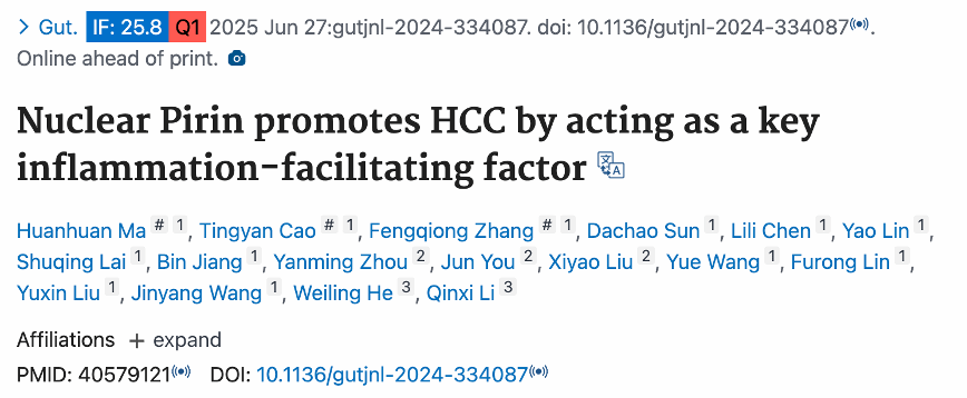 2025年6月27日,李勤喜教授、何伟玲教授团队在Gut杂志上在线发表题为Nuclear Pirin promotes HCC by acting as a key inflammation-facilitating factor的研究文章,首次揭示了核定位Pirin (PIR)在肝癌发生中的重要作用。