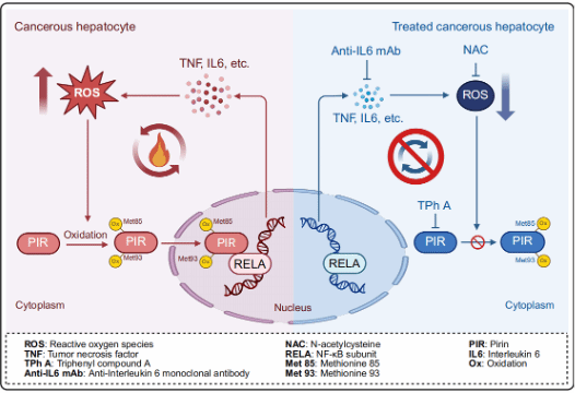研究发现,HCC发展过程中,肝细胞内ROS水平的升高会引起氧化应激传感蛋白PIR的甲硫氨酸85和93位点发生氧化修饰,导致PIR从细胞质转运至细胞核。在核内,PIR作为转录辅助因子与关键转录因子RELA协同作用,激活NF-κB信号通路,促进炎性细胞因子(如TNFα和IL-6)的表达,炎性细胞因子进一步刺激ROS产生,由此形成的正反馈环路不仅加剧了肝脏的炎症状态,也导致细胞内ROS水平持续升高,从而加速了肝细胞癌的发生和进展(图1)。此外,团队还探讨了针对PIR的干预策略。结果显示,使用抗氧化剂N-乙酰半胱氨酸(NAC)、PIR抑制剂TphA以及抗IL-6的单克隆抗体等切断上述正反馈环路均能有效抑制HCC的发展。这一发现不仅为揭示HCC发展中炎症与ROS相互作用的复杂机制提供了新视角,还为针对PIR的抗HCC疗法开拓了新的方向。未来,有望通过开发更有效的PIR抑制剂,探索其在治疗HCC中的潜力。