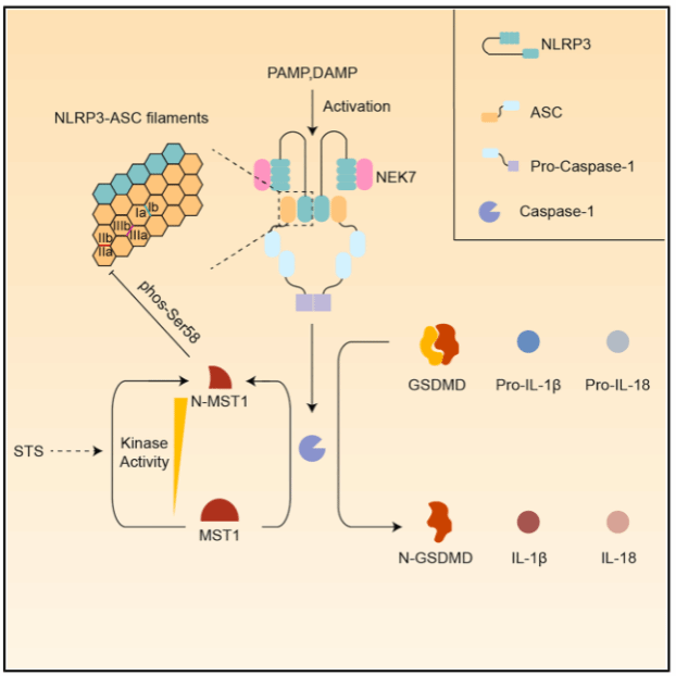 总之,这项研究发现了一个由Hippo信号通路激酶MST1介导的负反馈环路,维持ASC依赖型炎性小体以及机体炎症反应稳态,对于筛选开发靶向诱导MST1分子内剪切的抗炎药物具有重要的指导意义。