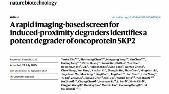 2025年9月10日,我院邓贤明团队与中国科学院分子细胞科学卓越创新中心姜海团队合作,在《Nature Biotechnology》在线发表题为 A rapid imaging-based screen for induced-proximity degraders identifies a potent degrader of oncoprotein SKP2 的研究论文。该研究突破性地构建了一种基于“死亡-存活”表型转换的高通量蛋白降解剂筛选体系(DEFUSE),并利用该平台成功发现了一个新型分子胶降解剂SKPer1,其可通过泛素连接酶STUB1高效降解肿瘤驱动蛋白SKP2,为攻克“不可成药”靶点提供了全新的技术路径与候选分子。
