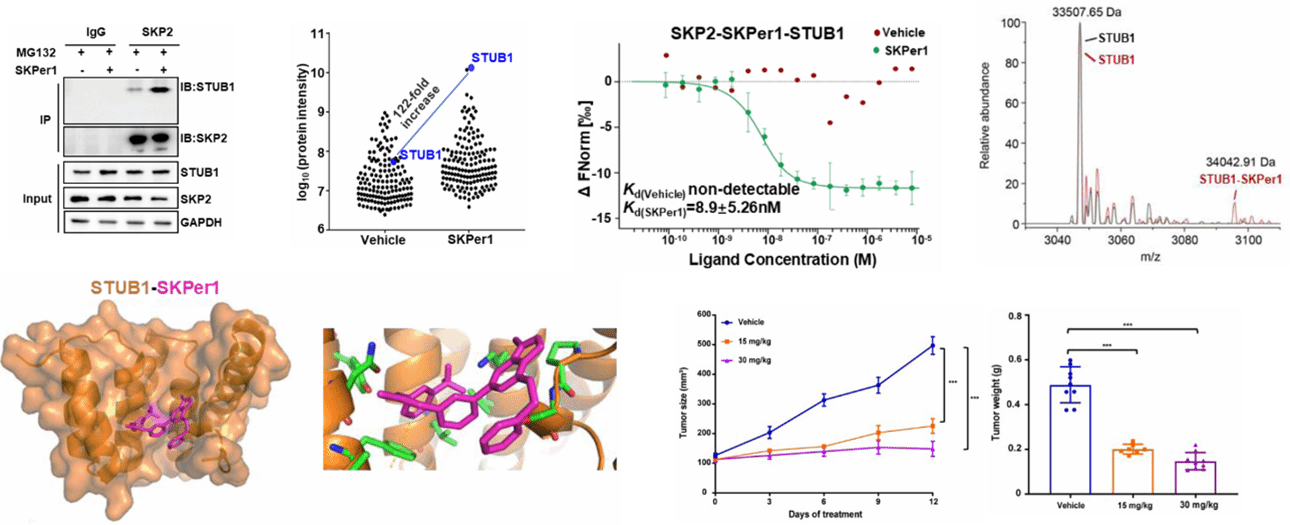 基于DEFUSE平台,邓贤明团队与姜海团队联合进行了肿瘤驱动因子SKP2(S-phase kinase-associated protein 2)的降解剂发现研究。SKP2是SCF(SKP1-CUL1-F-box)E3泛素连接酶复合物的关键底物识别亚基,在多种癌症中高表达,促进细胞周期蛋白p27等抑癌因子的降解,是公认的“不可成药”靶点。研究团队从上万个自主设计、合成的小分子中筛选获得小分子化合物SKPer1是一种高效的SKP2降解剂。机制研究表明,SKPer1并非直接抑制SKP2功能,而是促进SKP2与另一种E3泛素连接酶STUB1之间的物理相互作用,从而诱导SKP2的泛素化与蛋白酶体依赖性降解。微量热泳动(MST)和生物层干涉(BLI)实验显示,SKPer1显著增强SKP2与STUB1的结合亲和力,符合分子胶的典型特征;泛素化实验显示,SKPer1处理后,SKP2的多聚泛素化水平显著升高,且该过程依赖于STUB1的表达。更重要的是,SKPer1表现出显著的抗肿瘤活性:其选择性杀伤SKP2高表达的癌细胞系,并在小鼠异种移植模型中展现出良好的药代动力学特性、安全性及体内抑瘤效果。