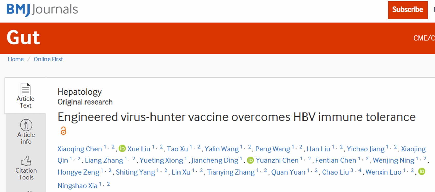 近日该研究成果以题为“Engineered virus-hunter vaccine overcomes HBV immune tolerance”的研究论文在线发表于Gut。中心陈小青、刘雪、许涛、汪雅琳为该论文共同第一作者。中心夏宁邵、罗文新、刘雪,药学院刘超为该论文共同通讯作者。该研究得到创新药物研发国家科技重大专项、国家重点研发计划、国家自然科学基金、中央高校基本科研业务费专项资金、广东省基础与应用基础研究基金、深圳市科技创新委员会项目、传染病疫苗研发全国重点实验室开放课题和翔安实验室科技项目支持。