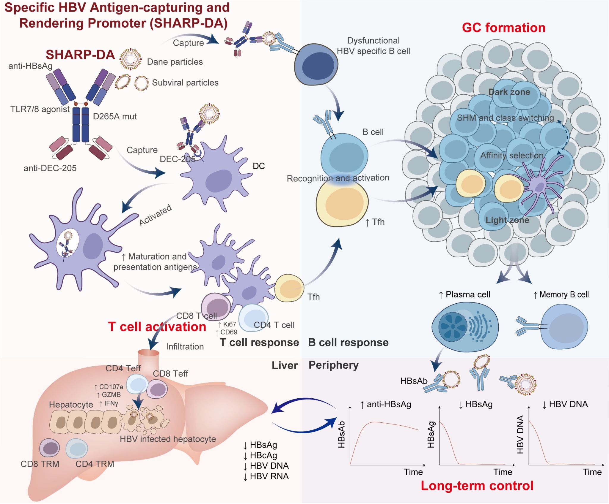 针对这一挑战,夏宁邵、罗文新团队基于前期建立的功能化抗体技术平台,成功构建了一类基于双特异性抗体的新型“病毒猎手疫苗”——“特异性HBV抗原捕获疫苗”(SHARP)。通过对靶向HBsAg和DC的功能结构域进行工程化重构,该疫苗被赋予双重功能:一方面具备针对HBV病毒颗粒的靶向识别与清除能力,另一方面可在捕获抗原后实现对DC的内源性抗原靶向递送。进一步地,通过偶联TLR7/8免疫激动剂,该疫苗可强化病毒抗原的吞噬清除,并有效促进DC活化,最终激活HBV特异性免疫应答。数据显示该疫苗能够显著降低血清中病毒及抗原载量,并提升DC对病毒抗原的摄取效率。在HBV慢性感染的小鼠模型中,SHARP治疗可实现长达161天的病毒抗原清除效果,且可诱导机体产生具有保护作用的HBV中和抗体。研究进一步发现,SHARP能够快速刺激体液免疫相关细胞,包括Tfh细胞、生发中心B细胞和浆细胞的比例和数量均上升,在脾脏中诱导活跃的生发中心的形成;并且在SHARP治疗后小鼠生发中心B细胞和浆细胞中IgG相关基因的表达上调,IgA相关基因的表达下调,说明SAHRP治疗促进了B细胞的类别转化,最终通过分泌IgG型别的抗病毒抗体发挥长期保护作用。此外,SHARP治疗诱导了抗病毒细胞免疫应答的恢复,主要表现为HBsAg和HBcAg特异性的CD4+和CD8+T细胞的细胞毒性分子的分泌显著升高。同时,在对功能性治愈的小鼠进行HBV病毒再攻毒的研究中发现HBV无法建立慢性感染,且在免疫后到期的小鼠脾脏组织中检测到显著升高的记忆B细胞和病毒特异性B细胞以及各种记忆T细胞表型比例和数量的显著上调,说明SHARP治疗在慢乙肝小鼠模型中重建了抗病毒免疫记忆,从而实现对病毒感染的长效控制。