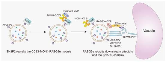 综上所述,研究人员通过显微成像、遗传学、蛋白互作和超微结构分析,揭示了RAB7家族成员RABG3e在植物自噬体与液泡融合中的核心作用,并首次构建了一个由SH3P2→CCZ1-MON1→RABG3e→VPS39→SNARE复合体依次串联的全新调控模型。这项研究不仅解决了植物自噬研究中的一个重要争议,也为未来解析农作物抗逆提供了理论基础。