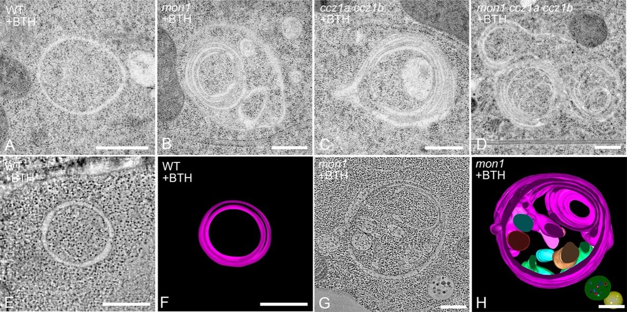 研究人员首先通过对RABG3家族蛋白进行系统定位分析,发现RABG3e能够特异性定位于ATG8e标记的环状晚期自噬体上,而不定位在ATG13a标记的早期自噬泡上,提示其主要参与自噬体成熟阶段。进一步的生化和遗传学分析显示,RABG3eT22N、mon1、ccz1a ccz1b突变体中的自噬通量显著下降,且均表现出早衰和对氮素缺乏敏感的表型。透射电镜(TEM)和电子断层扫描揭示了令人惊讶的结果:在RabG3e功能失活突变体中,自噬体不断被新的膜层包裹,形成“洋葱圈式”的异常结构。