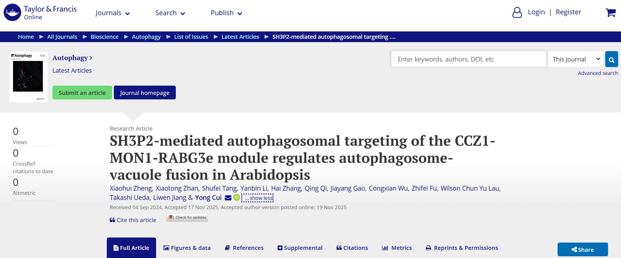 近日,厦门大学崔勇教授团队在国际知名学术期刊Autophagy发表题为SH3P2-mediated autophagosomal targeting of the CCZ1-MON1-RABG3e module regulates autophagosome-vacuole fusion in Arabidopsis的研究论文,首次系统性地揭示了植物自噬体与液泡融合的关键分子机制。