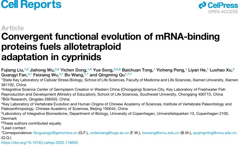 2025年11月26日,我院瞿清明团队在《Cell Reports》上发表题为“Convergent functional evolution of mRNA binding proteins fuels allotetraploid adaptation in cyprinids”的研究论文。该研究基于染色体级别的基因组组装和系统的比较基因组学分析,首次揭示了黑脊倒刺鲃(Spinibarbus caldwelli)中存在长片段同源交换及渐进式再二倍化现象,以及鲤科鱼类异源四倍体在多次独立演化过程中出现的趋同适应性演化机制。