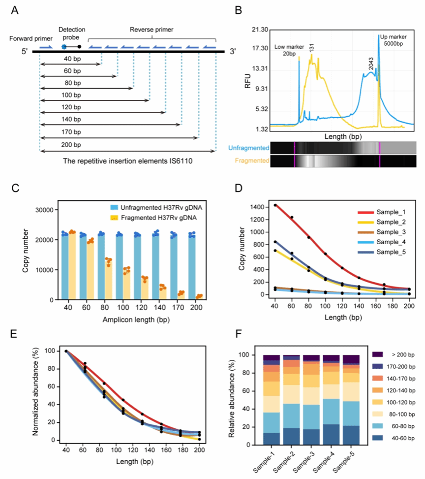 图1. 解析胸腔积液中结核cfDNA的特征。(A)IS6110区域扩增子示意图;(B) 毛细管电泳评估DNA模板长度;(C) PCR扩增未碎片化与碎片化的H37Rv gDNA;(D) 五例确诊TBP患者胸腔积液样本的ddPCR拷贝数;(E) 样本中拷贝数的归一化检测;(F) 不同大小区间下患者MTB cfDNA的长度分布。