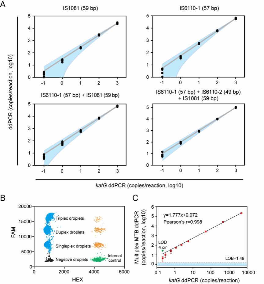 图2. MTB cfDNA ddPCR检测方法的分析评价。(A) ddPCR检测中不同靶点数量和输出稳定性分析;(B) TB ddPCR检测的典型结果;(C) TB ddPCR体系检测下限(LOD)分析。