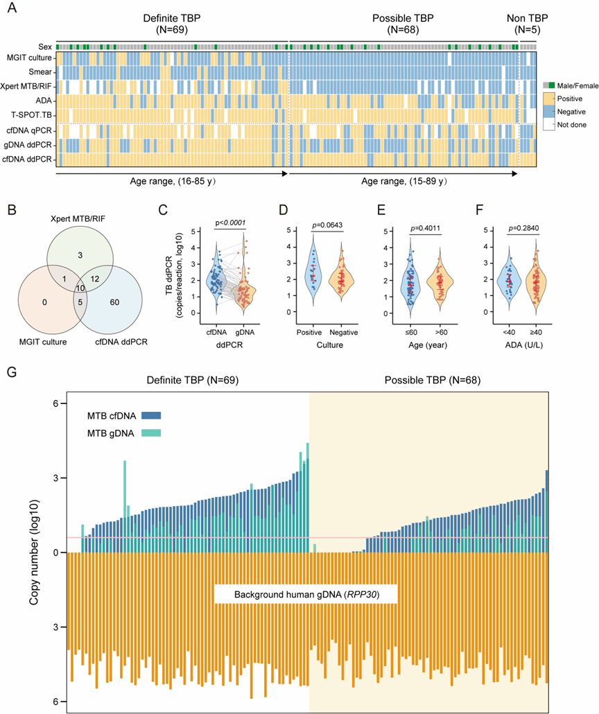 图3. MTB cfDNA ddPCR在结核性胸膜炎患者中的诊断表现。(A)TBP患者的各项检测结果;(B)TBP患者中MGIT培养、Xpert MTB/RIF和cfDNA ddPCR阳性结果的韦恩图;(C)cfDNA与gDNA阳性配对胸腔积液样本的核酸含量比较;(D)培养阳性与阴性胸腔积液样本中cfDNA含量比较;(E)不同年龄组胸腔积液中cfDNA含量比较;(F)不同ADA水平样本中cfDNA含量比较;(G)确诊与临床诊断TBP患者的MTB cfDNA和gDNA核酸分布。