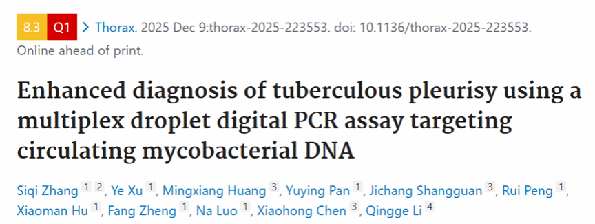 厦门大学生命科学学院李庆阁教授团队与福州肺科医院合作,系统解析了结核性胸腔积液中MTB游离DNA(cell free DNA, cfDNA)的生物学特征,并开发了一种基于MTB cfDNA 的多重微滴式数字PCR(droplet digital PCR, ddPCR)检测技术,显著提高了TBP的早期诊断效能。该研究成果12月9日在线发表于呼吸病学领域权威期刊Thorax,标志着我国在结核病精准诊断技术方面取得重要进展。