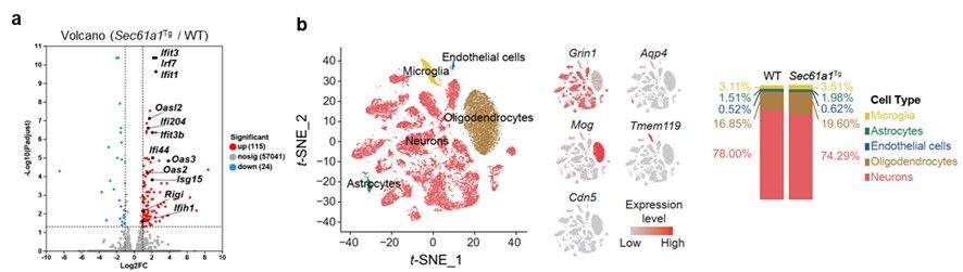 为验证这一假设,研究人员在小鼠大脑神经元中特异性过表达SEC61A1,成功模拟了衰老及AD相关的关键病理表型。分子层面检测再次证实,SEC61A1过表达激活了mt-dsRNA介导的天然免疫通路,诱发显著的神经炎症,并导致认知功能损伤。转录组与单细胞核测序进一步揭示,神经元特异性过表达SEC61A1后,神经炎症信号显著增强,神经元数量明显减少,且在神经元特异性上调基因中富集了多种神经退行性疾病相关通路。