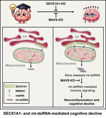 衰老是认知衰退的主要诱因,但驱动衰老相关认知衰退的分子机制仍不清楚。近日,王耿教授团队在《Cell Research》杂志上发表了题为《Mitochondrial double-stranded RNA drives aging-associated cognitive decline》的研究论文。该研究首次揭示了内质网蛋白SEC61A1是调控mt-dsRNA稳态的关键因子,该蛋白在衰老大脑中特异性上调,通过增强内质网-线粒体接触(ERMCS),促进线粒体转录,导致mt-dsRNA生成与累积,激活胞质MDA5/RIG-I-MAVS天然免疫通路,从而驱动衰老相关的认知衰退。