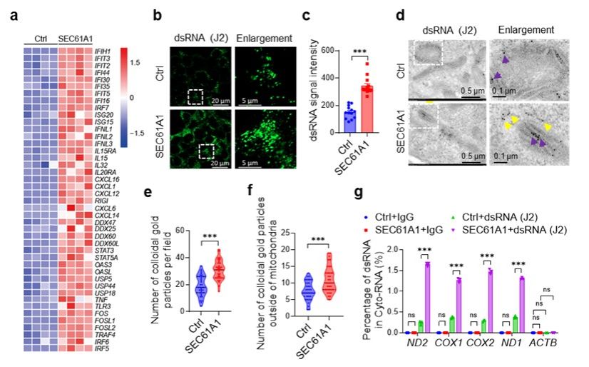 为明确激活dsRNA信号的内源性RNA来源,研究人员整合了免疫电镜胶体金标记、免疫荧光共聚焦成像、dsRNA特异性抗体(J2)免疫共沉淀等多层次技术,并通过线粒体DNA删除及转录抑制实验进行功能溯源。最终证实:SEC61A1过表达引发的胞质dsRNA累积与天然免疫激活,其根本来源是线粒体转录产物mt-dsRNA。该调控模式在HEK293细胞及神经元系N2a细胞中均得到验证。