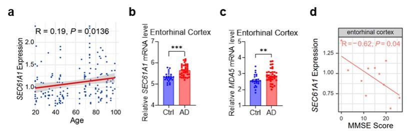 研究人员发现,在自然衰老小鼠的皮层组织及AD患者皮层组织中,SEC61A1及dsRNA感受器的表达水平均显著上调。通过对AD患者现有RNA测序数据的分析,SEC61A1的表达量与简易精神状态检查(MMSE)评分呈显著负相关,提示SEC61A1的高表达可能是AD患者认知功能下降的促进因素之一。