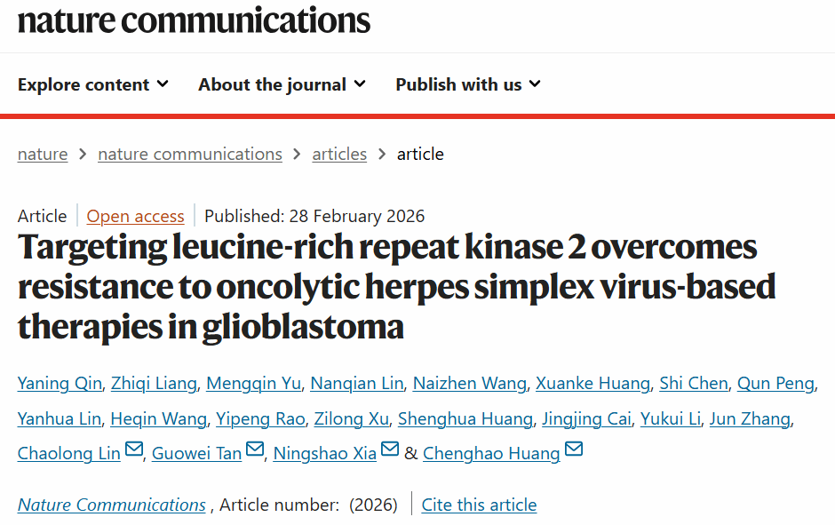 近日,该研究成果以题为“Targeting leucine-rich repeat kinase 2 overcomes resistance to oncolytic herpes simplex virus-based therapies in glioblastoma”的研究论文在线发表于《自然·通讯》(Nature Communications)。秦雅宁、梁芷萁、余梦芹、林南倩、王乃禛、黄宣科、陈师为该论文的共同第一作者,夏宁邵、黄承浩、林超龙,厦门大学附属第一医院谭国伟为该论文的共同通讯作者。该研究得到了国家科技部国家科技重大专项、国家自然科学基金及中央高校基本科研业务费专项资金的资助与支持。