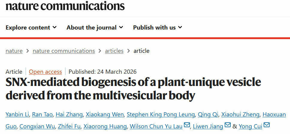 近日,厦门大学崔勇教授团队联合香港中文大学姜里文教授团队和香港理工大学 Wilson Chun Yu Lau 教授团队,在 Nature Communications 发表了题为 “SNX-mediated biogenesis of a plant-unique vesicle derived from the multivesicular body” 的研究论文。该研究综合运用光电联用显微技术、三维电子断层扫描、冷冻电镜及全原子分子动力学模拟等手段,首次鉴定出一种来源于多囊泡体的植物特有运输囊泡。