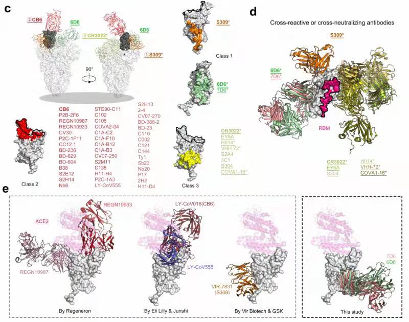 广谱中和抗体7D6/6D6识别表位及与其他已报道新冠抗体比较