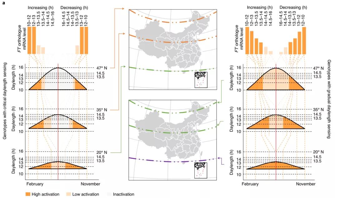 随着全球气候变化,各种作物趋向往温度适宜的高纬度扩张。同时,中低纬度地区,需要利用耐热、耐旱、耐涝等种质资源进行品种改良,以减少气候变化带来的负面影响,确保产量。此外,全球变暖延长了不同纬度夏季作物的生长季节,重新调整现有作物的轮作方式,有利于实现产量最大化。这些过程都亟需对作物进行纬度适应性改良。作物的纬度适应性是指在特定的生态环境,作物全生育期与该生态区作物生长季节保持一致,从而实现产量的最大化。作物的纬度适应性对于品种选育与引种、杂交种制种与产量都极为重要。传统育种中,育种家通过调整生育期,改良作物纬度适应性。作物的感光性(光周期开花)是生育期调控的决定性因素。