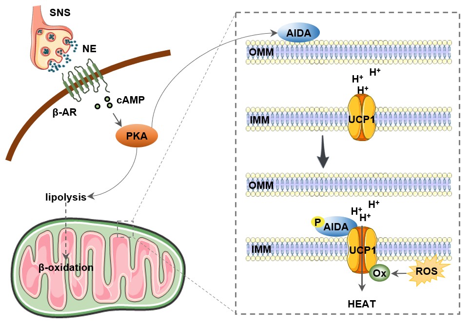 图:AIDA通过UCP1直接将交感神经系统与适应性产热串联起来的模式图