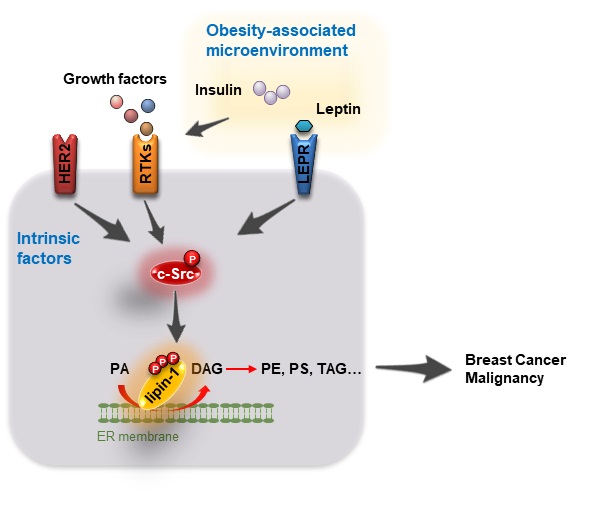 图:在内外刺激下,Src通过磷酸化lipin-1提高脂质合成而促进乳腺进展和恶化的模式图