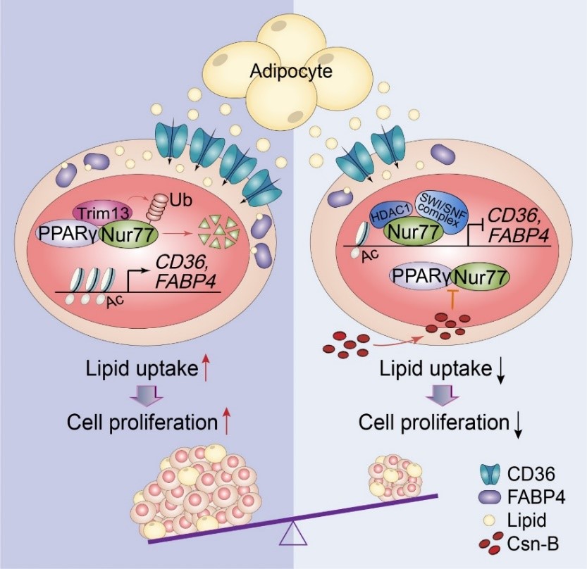在这项研究中,吴乔课题组首先在PyMT自发性乳腺癌小鼠模型和化学试剂(MPA-DMBA)诱导的小鼠模型中证明了敲除Nur77可促进小鼠乳腺肿瘤发展,而在敲除Nur77的PyMT小鼠乳腺组织中重新特异性表达Nur77后则抑制乳腺肿瘤进展。信号转导通路研究发现,Nur77通过招募SWI/SNF复合体抑制脂肪酸吸收相关基因CD36和FABP4的表达,阻断乳腺癌细胞对外源脂肪酸的吸收,从而抑制肿瘤细胞的增殖。但是乳腺癌细胞中的另外一个核受体PPARγ通过募集泛素连接酶Trim13靶向底物蛋白Nur77,诱导Nur77的泛素化降解。因此,阻断PPARγ与Nur77的相互结合有望保证Nur77抑制乳腺癌细胞生长的功能发挥。通过大量的化合物筛选分析,吴乔课题组发现了小分子化合物cytosporone B (Csn-B)能够靶向Nur77的配体结合域(LBD),阻断PPARγ与Nur77之间的结合,从而加强Nur77抑制乳腺癌进程。在此基础上,林天伟课题组解析了Nur77-LBD与Csn-B的共晶结构以及Nur77-LBD与PPARγ分子对接模型,在分子水平上进一步明确了小分子化合物Csn-B结合Nur77的关键作用位点,同时证明了Csn-B增强Nur77同源二聚体的形成,通过空间位阻阻断了PPARγ与Nur77的结合,由此拮抗PPARγ诱导的Nur77泛素化降解,保证Nur77抑制外源脂肪酸摄取最终抑制乳腺癌的发展进程。