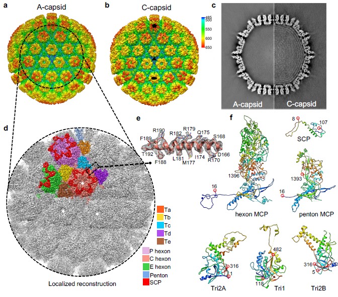 9月7日,夏宁邵教授团队在《自然》子刊《自然•微生物学》(Nature Microbiology)上发表题为“Near-atomic cryo-electron microscopy structures of varicella-zoster virus capsids”的研究论文。该研究首次揭示了疱疹病毒α家族的水痘-带状疱疹病毒(VZV)不同类型核衣壳的近原子分辨率结构,阐明了VZV核衣壳不同组成蛋白的相互作用网络与衣壳装配机制,可为进一步开展新型载体疫苗设计及抗病毒药物等研究提供重要支持。