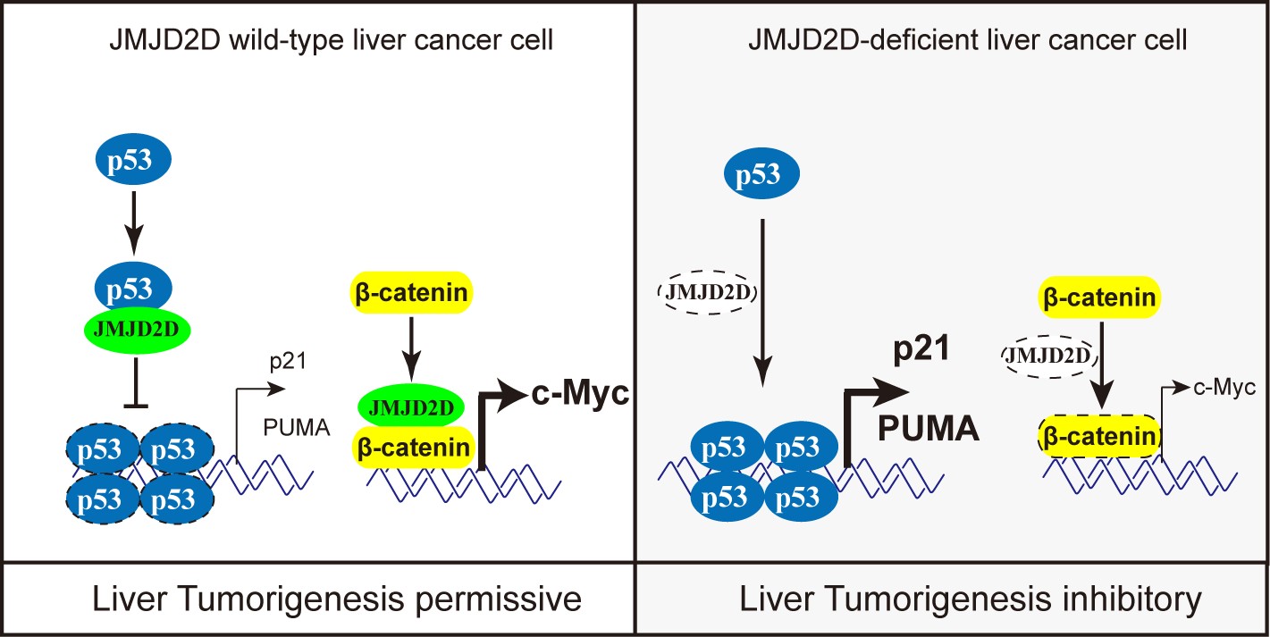 该研究发现:与癌旁组织相比,JMJD2D的表达在人肝癌标本中显著上调,并且这种高表达与患者的不良预后呈正相关。下调JMJD2D的表达可抑制肝癌细胞增殖和异种移植瘤的生长,增强肝癌细胞对化疗药物诱导凋亡的敏感性,以及促进细胞周期抑制因子p21和促凋亡基因PUMA的表达。在遗传学上,JMJD2D敲除抑制了DEN诱导的小鼠肝癌的发生和发展。敲除抑癌基因p53显著降低了JMJD2D下调对细胞增殖、凋亡以以及p21和PUMA表达的影响,提示JMJD2D可以通过抑制p53信号通路来促进肝癌细胞的增殖和成活。机制上,JMJD2D直接与p53蛋白的DNA结合结构域相结合,以不依赖去甲基化酶活性的方式抑制p53在其靶基因p21和PUMA的启动子上募集,进而抑制p53的转录活性。这些结果表明JMJD2D是一种新型的p53拮抗分子,其对p53的拮抗作用不依赖于去甲基化酶的活性。另外,JMJD2D可以以去甲基化酶活性依赖的方式激活Wnt/β-catenin信号通路来促进肝癌细胞的增殖。