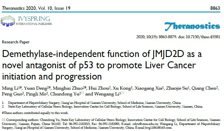 2020年7月12日,细胞应激生物学国家重点实验室、厦门大学生命科学学院俞春东教授课题组和厦门大学医学院李文岗教授课题组在《Theranostics》在线发表题为“Demethylase-independent function of JMJD2D as a novel antagonist of p53 to promote Liver Cancer initiation and progression”的研究论文。该研究表明组蛋白去甲基化酶JMJD2D可以通过抑制p53信号通路以及激活Wnt/b-catenin信号通路来促进肝癌的发生和进展。