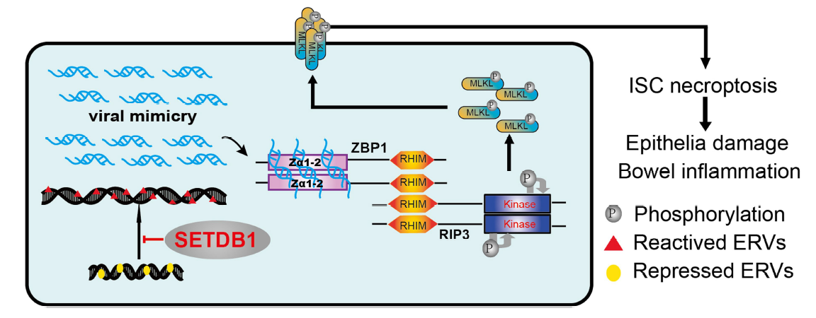 在坏死样凋亡中,RIP1和RIP3,RIP3和RIP3间通过两者共有的RHIM结构域相互结合。ZBP1是另外一个具有RHIM结构域的蛋白。之前的工作发现少数病毒,比如流感病毒IAV,小鼠巨细胞病毒(MCMV)可以通过ZBP1激活坏死。在非感染情况下,ZBP1介导的坏死只有在RIP1 RHIM结构域突变的小鼠上发现11,但是其生物学意义和机制仍是未知。3月17号的cell杂志报道了IAV激活ZBP1起始坏死的具体机制。Siddharth课题组发现IAV产生的ZRNA是促发坏死的死亡信号12。 本文作者通过对转录组的KEGG分析,发现在Setdb1敲除的肠干细胞中,有大量类病毒的积累。通过对结合在ZBP1上的核酸进行测序分析,发现这些核酸是ERV RNA。ZBP1的N端有结合核酸的结构域,如果将此结构域剔除,Setdb1敲除导致的肠干细胞死亡可被抑制。由此,作者认为,Setdb1的缺失使得ERV重新活跃,破坏了基因组的稳定性,大量积累的ERV RNA作为死亡信号,结合并激活ZBP1启动坏死样凋亡。