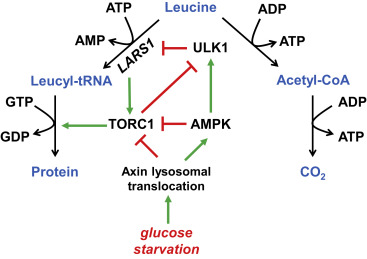 葡萄糖是机体内最为丰富的营养物,其饥饿可以引起AMPK激活,后者在激活后,将会利用其激酶活力抑制mTORC1的活力。同时,葡萄糖饥饿还能诱发AXIN迁移到溶酶体膜上,改变Ragulator-RAG复合体的功能,加速mTORC1从溶酶体上的解离以抑制其活力。新近,韩国首尔国立大学的Ina Yoon及其合作者们在Science上发表题名为”Glucose-dependent control of leucine metabolism by leucyl-tRNA synthetase 1”的文章,报道了AMPK能够通过激活下游的ULK1分子,进一步磷酸化LARS1这一亮氨酰-tRNA合成酶,再通过调节RAG而促进mTORC1的解离。该评论文章结合了这一新发现,指出葡萄糖饥饿不仅可以通过抑制mTORC1来抑制翻译起始,还可通过抑制tRNA氨基酸酰化来多重地抑制蛋白质翻译,概述了mTORC1被精确调节的多重的机制。