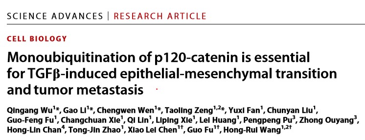 近日,我院王洪睿教授课题组和付国教授课题组在《Science Advances》上合作发表了“Monoubiquitination of p120-catenin is essential for TGFβ-induced epithelial-mesenchymal transition and tumor metastasis”的研究论文。