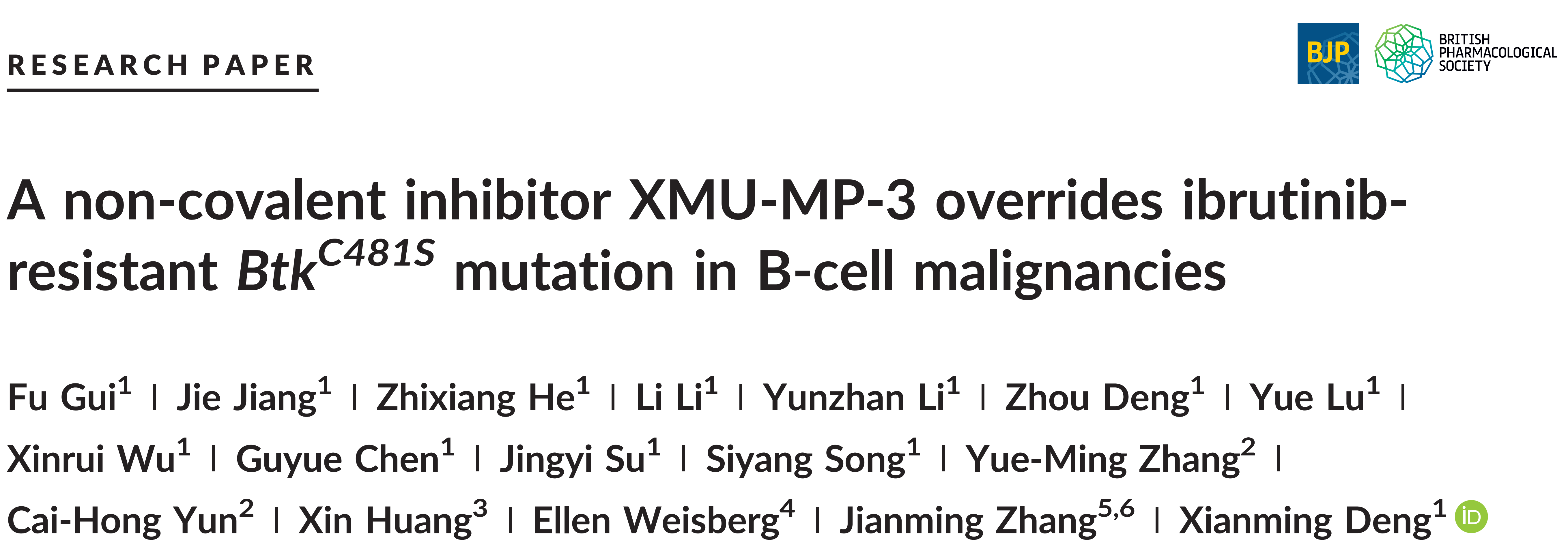 近日,我院邓贤明教授课题组在药学研究领域重要期刊《British Journal of Pharmacology》上发表题为“A non-covalent inhibitor XMU-MP-3 overrides ibrutinib-resistant Btk C481S mutation in B-cell malignancies”的研究论文,报道了克服BTKC481S耐药B细胞淋巴瘤的非可逆BTK新颖抑制剂。