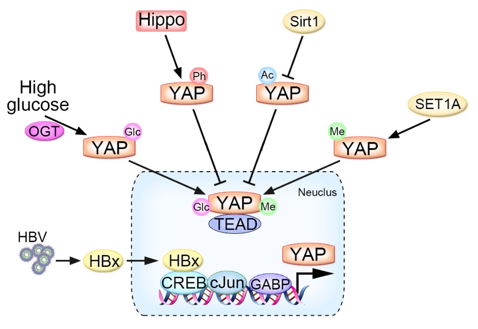 图2. Hippo信号通路效应分子YAP蛋白修饰与表达调控网络