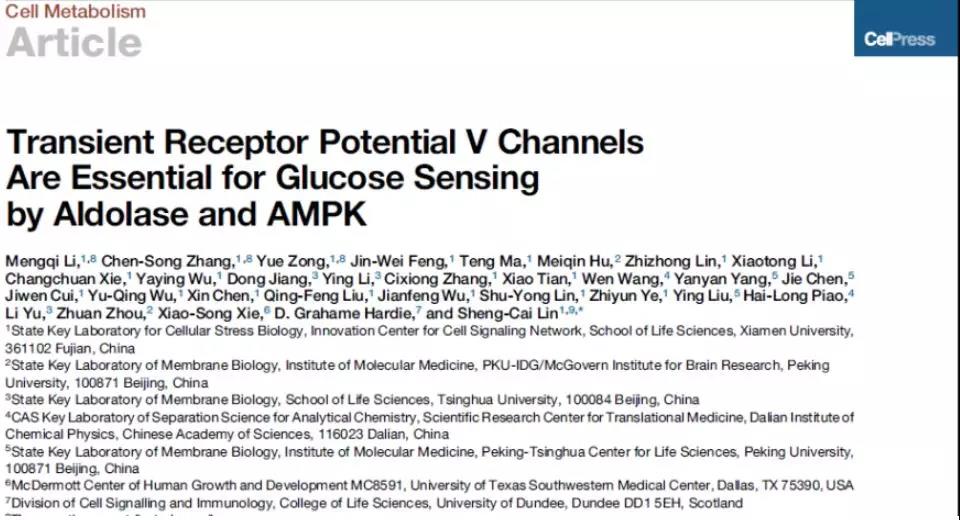 2019年6月13日, Cell Metabolism杂志在线发表了林圣彩教授的最新成果:Transient Receptor Potential V Channels Are Essential for Glucose Sensing by Aldolase and AMPK,发现阳离子通道蛋白TRPV介导葡萄糖感知到AMPK激活的过程的作用和机制,为葡萄糖感知和AMPK激活的“路线图”添上了重要的一笔,可视为让葡萄糖感知通路全线贯通的重要一环。