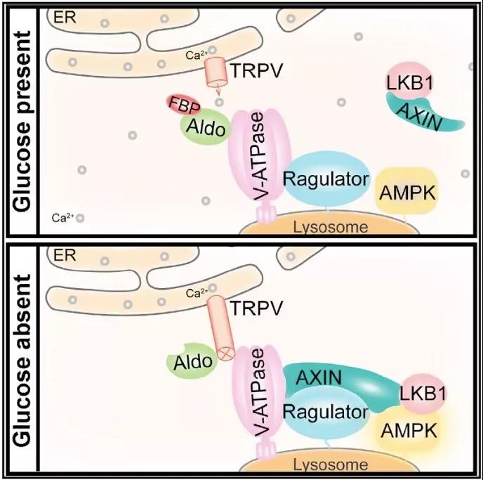 该工作是在该课题组2017年发现的基础上的进一步延伸。首先他们通过质谱分析鉴定出了阳离子通道家族TRPV可与醛缩酶蛋白结合;这一结合可被生理浓度的FBP所抑制。他们还观察到在葡萄糖水平降低的情况下,FBP的浓度也随之降低,TRPV的钙离子通道活性被抑制。其后,他们发现无论是通过小分子抑制剂抑制TRPV通道活性还是钙离子螯合剂降低胞内钙离子水平,均可以阻碍溶酶体酸化,提示了v-ATPase活性受到了影响。在加入钙离子螯合剂时即使葡萄糖水平正常,AXIN蛋白也定位于溶酶体,AMPK可被磷酸化。进一步的工作表明,TRPV位于内质网和溶酶体接触的区域;葡萄糖水平下降可造成内质网-溶酶体附近胞内区域钙离子浓度的降低。最后他们的工作证明了未结合FBP的醛缩酶可结合TRPV并抑制其钙离子的通道活性;钙离子浓度下降促使了醛缩酶-v-ATPase复合体的变构,从而抑制v-ATPase,最终启动溶酶体上的AMPK激活途径,引起此处AMPK的活化(下图)。