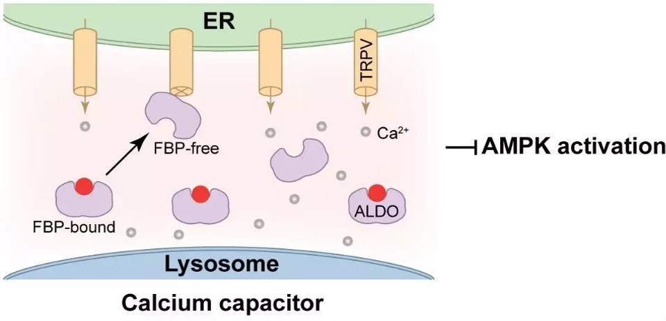 在这里,醛缩酶既能够结合FBP从而感知FBP的水平,又能够催化FBP裂解成三碳糖。如果没有TRPV的参与,不断经历与底物FBP的结合-催化-不结合“周期”的醛缩酶就会引起v-ATPase和AMPK的活性的剧烈变化。TRPV的出现使得局部震荡式变化的FBP水平被“缓冲”成了一种相对稳定的、钙离子浓度的变化。具体地说,FBP足够高时,每一时刻总有一定数量(尽管不是全部)的醛缩酶结合着FBP,使其附近的TRPV保持着活力并进一步维持附近的钙离子浓度以维持v-ATPase的活力,阻止AMPK的“贸然”激活;只有当葡萄糖浓度真正下降,能够结合FBP的醛缩酶的比例真正地降低的时候,钙离子浓度才会因为TRPV的抑制而下降,允许TRPV进一步与v-ATPase结合并改变其构象,导致AMPK的激活。作者把上述TRPV的这一功能比喻成类似于电容器的”钙容器”(calcium capacitor),在时间和空间上确保了AMPK和其下游的重要途径的调控的精确性和可靠性。