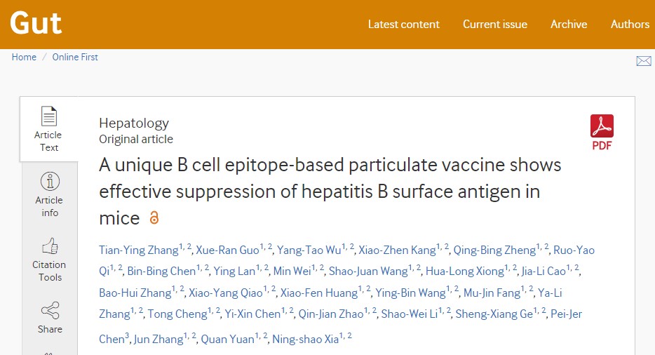 3月29日,国际权威胃肠肝病期刊Gut(IF=17.016)在线刊出了夏宁邵教授团队题为“A unique B cell epitope-based particulate vaccine shows effective suppression of hepatitis B surface antigen in mice”的研究论文。该研究发展了一种新型的B细胞表位嵌合型类病毒颗粒乙肝治疗性疫苗(乙肝治疗性蛋白),在多种模型中证实了其对慢性乙肝感染的治疗潜力,为研发治疗慢性乙肝的原创药物提供了新思路。