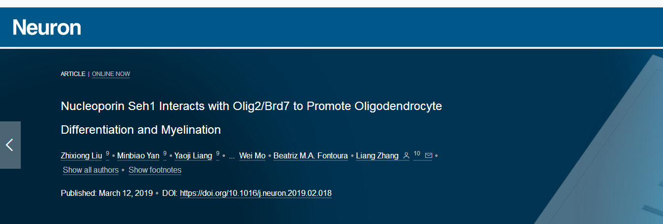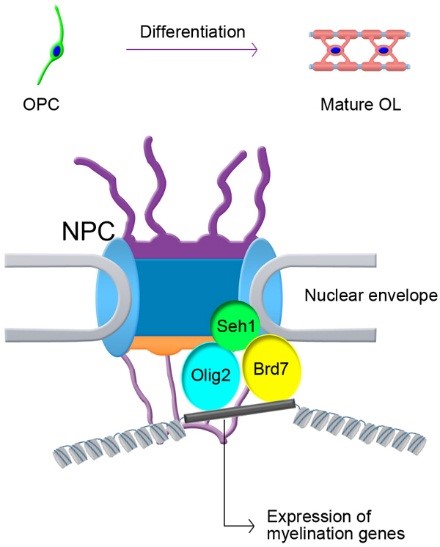 2019年3月13号,细胞应激生物学国家重点实验室、细胞信号网络协同创新中心、厦门大学生命科学学院的张亮副教授课题组在Neuron杂志上发表了题为Nucleoporin Seh1 Interacts with Olig2/Brd7 to Promote Oligodendrocyte Differentiation and Myelination的论文,揭示了核孔蛋白Seh1在少突细胞分化及髓鞘生成中的功能和作用机制。在这项研究中,研究人员构建了Seh1少突细胞谱系特异性敲除的小鼠,发现该基因的缺失会造成少突细胞分化的阻滞和髓鞘生成的缺陷。在脱髓鞘损伤模型中,利用工具鼠诱导成体少突前体细胞中Seh1缺失后,研究人员发现突变小鼠也存在相似的髓鞘再生障碍和成体少突前体细胞的分化受阻的表型。进一步的研究发现,Seh1发挥以上生理功能并不依赖于对少突细胞核质运输的调控,而是通过在核孔复合体周围招募转录因子Olig2和染色质重塑蛋白Brd7,从而组装一个促进少突细胞分化的转录复合体,在细胞核外周营造一个利于基因转录的微环境,促进髓鞘生成相关基因的表达。