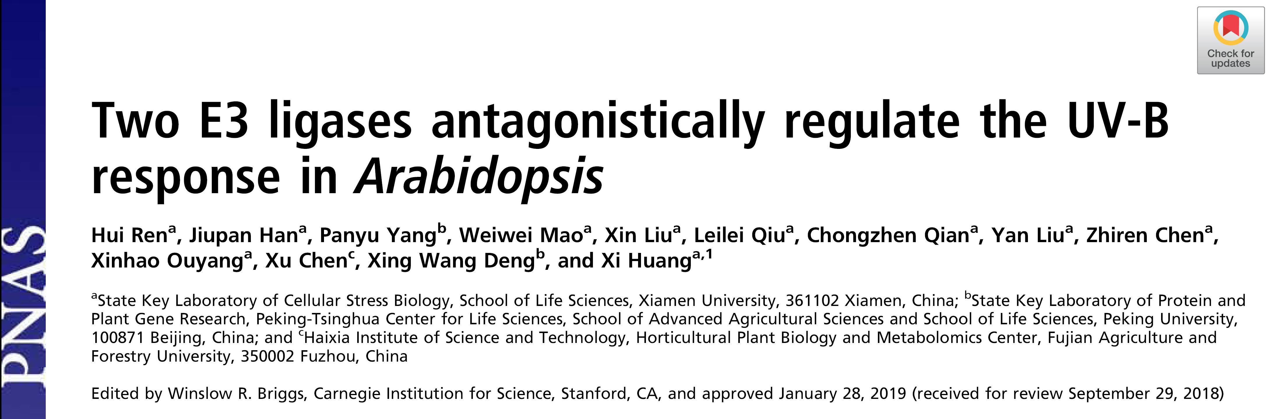 2019年2月20日,细胞应激生物学国家重点实验室、厦门大学生命科学学院黄烯教授课题组在PNAS在线发表了题为Two E3 Ligases Antagonistically Regulate the UV-B Response in Arabidopsis的研究论文,揭示了拟南芥中两类泛素连接酶形成“抑制”与“去抑制”机器,拮抗调控UV-B光形态建成的分子机制。