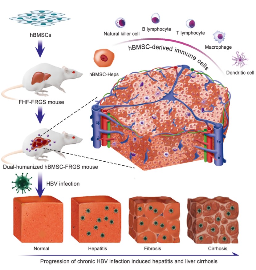 通过协同攻关,他们基于自主构建的免疫缺陷的FRGS小鼠暴发性肝衰竭模型,在人BMSC移植后证实小鼠体内出现人源肝细胞和多种免疫细胞,成功构建了肝细胞和免疫细胞双重人源化的小鼠模型。该小鼠模型感染HBV后,HBV关键指标持续阳性,长期处于慢性炎症状态,并渐进性出现肝纤维化和肝硬化。这是国内外首次利用单种的人BMSC移植实现了人同源肝细胞与多种免疫细胞在小鼠体内的双重嵌合,成功模拟了人类HBV自然感染和乙肝肝硬化发病过程,解决了HBV感染与发病机制研究和抗乙肝肝硬化新药研发缺少高质量动物模型的国际难题。