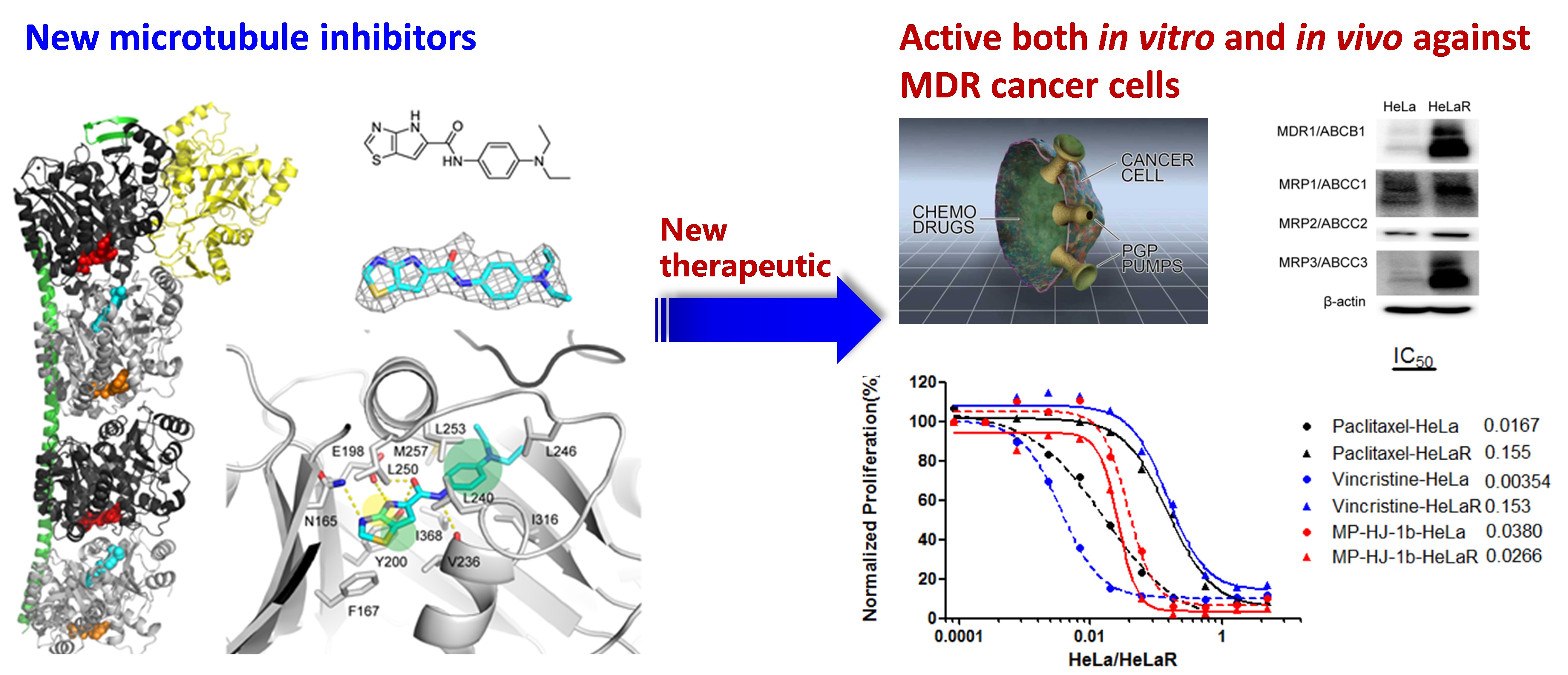 微管抑制剂是肿瘤临床治疗中广泛使用的一类化疗药物。然而,肿瘤的多重耐药(multidrug resistance, MDR)是微管抑制剂临床应用中的重大挑战。通过高通量筛选和进一步的构效关系优化,该研究团队得到了一类杂环酰胺类化合物(以MP-HJ-1b为例),是一类潜在的肿瘤生长抑制剂,在多种组织来源的1000余株人源肿瘤细胞系中显示出良好的抗肿瘤活性。进一步研究表明,MP-HJ-1b与传统的微管阻断剂不同,能够在体内和体外诱导微管形成特殊的“spike-like”构象,从而抑制微管聚合并影响纺锤体形成。蛋白晶体结构分析表明,这类化合物能够结合在微管蛋白二聚表面的秋水仙碱结合口袋中,但与秋水仙碱几乎没有重叠。MP-HJ-1b具有良好的药理学特性,在克服肿瘤多重耐药方面具有优异表现。这一类新颖微管蛋白抑制剂的发现为克服肿瘤多重耐药问题提供了新策略。