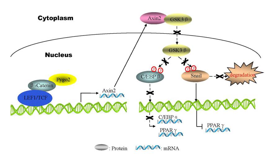 人类等哺乳动物能够通过维持能量摄取和能量消耗的平衡长时间内保持体重的稳定。但是,当能量摄取增多或者能量消耗减少时将导致肥胖以及糖尿病。目前,肥胖以及糖尿病已经成为威胁人类健康的关键因素之一。李博安教授课题组经过研究发现,染色质效应因子Pygo2在前脂肪细胞成脂分化过程中表达逐渐关闭,其介导的Wnt信号输出也逐渐减弱。进而导致其下游靶基因Axin2在胞浆的表达下降。由于Axin2在胞浆内能够结合GSK3β并将其滞留在胞浆,因而Axin2在胞浆的减少能够释放GSK3β进入细胞核并进一步磷酸化C/EBPβ和Snail。磷酸化的C/EBPβ是其结合C/EBPα、PPARγ启动子促进转录的必要条件;另一方面,Snail作为转录抑制因子会直接抑制PPARγ的表达,而磷酸化的Snail会导致自身泛素化降解。这样,磷酸化的C/EBPβ和Snail会通过上述机制增强C/EBPα、PPARγ的表达而促进脂肪细胞分化。通过脂肪前体细胞特异性基因敲除小鼠实验,他们发现,Pygo2基因敲除小鼠在常规饮食条件下即可发生肥胖,并伴随脂肪细胞肥大。对于脂肪组织基因表达谱分析发现,除了C/EBPα、PPARγ表达增强外,引起胰岛素耐受的炎性因子TNFα、IL6表达增高。另一方面,脂肪酸氧化关键基因MCAD和Cpt1b都在Pygo2基因敲除小鼠中明显下调,与此对应的是,小鼠氧气、二氧化碳消耗与产热等能量消耗指标都明显下降。他们还进一步发现,Pygo2基因敲除小鼠的葡萄糖耐受、胰岛素敏感性均受到损害。该研究揭示了Wnt信号调节脂肪与糖代谢稳态的始动因素与下游分子机制。 因此,Pygo2可作为一个潜在的靶点,用于肥胖、糖尿病等相关疾病的预防与治疗。