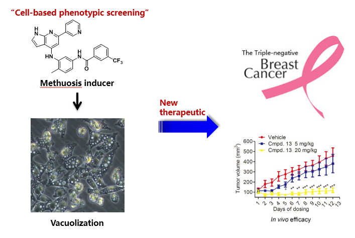 巨泡式死亡(Methuosis)是有别于凋亡、坏死与自噬的一种新的细胞死亡方式,其特征在于细胞产生空泡化,空泡之间相互融合,最终细胞质中充满巨大液泡,从而导致细胞死亡。由于不通过经典的凋亡途径起作用,巨泡式死亡诱导剂有望克服临床常见的凋亡诱导剂的耐药问题,并且有望用于目前尚无有效治疗手段的癌症,如三阴性乳腺癌。因此,开发巨泡式死亡诱导剂在肿瘤治疗领域具有重要意义。该研究团队通过表型筛选,从自身构建的特色聚焦化合物库中找到了能够引起细胞空泡化的化合物,经过进一步的结构优化与改造,获得了空泡效果显著,对多种肿瘤细胞(包括MDA-MB-231, A375, HCT116, MCF7等)具有生长抑制活性(IC50 = 0.33 ~ 2.61 μM),而对非肿瘤细胞(MCF10A)生长无抑制作用(IC50 > 10 μM)的小分子化合物Cpmd. 13。机理研究表明,Cmpd. 13能选择性地显著诱导细胞产生空泡化,空泡的产生与线粒体、内质网、自噬体无关,而与巨胞饮、溶酶体、内体密切相关;它通过诱导巨泡式死亡而抑制肿瘤细胞的生长与增殖。更重要的是,Cmpd. 13在三阴性乳腺癌细胞(MDA-MB-231)的裸鼠异种移植瘤模型中表现出了良好的治疗效果,代表了首例具有体内药效的巨泡式死亡诱导剂,首次在体内验证了通过诱导巨泡式死亡作为新的肿瘤治疗策略的可能性。该工作发表后得到了国际同行的关注,与感兴趣的新药研发公司的转让合作也在洽谈中。