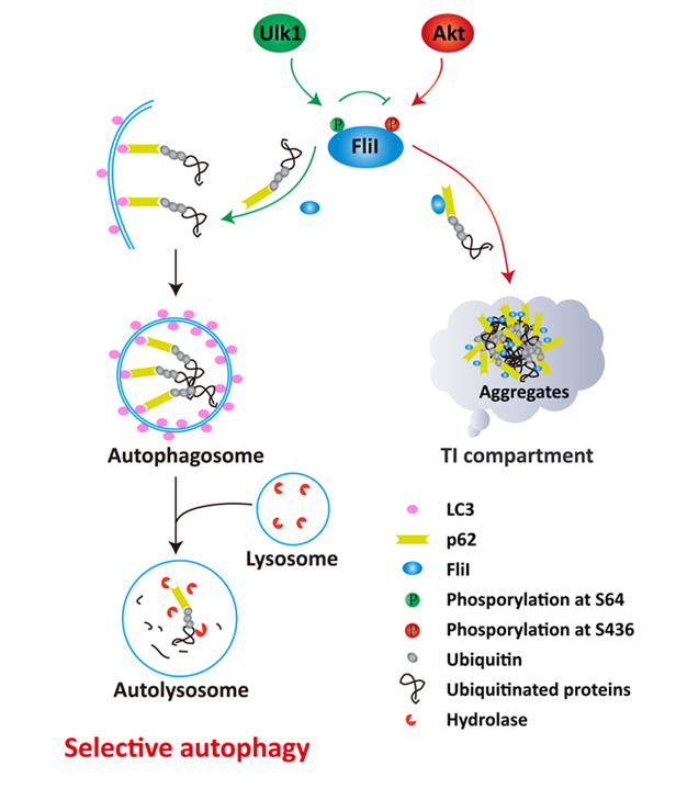 选择性自噬是细胞以自噬的方式选择性清除受损的蛋白或细胞器的过程,作为细胞的质量控制系统在细胞稳态的维持中发挥重要作用,选择性自噬失调则可能造成肿瘤的发生。p62是最主要的自噬受体之一,介导多种选择性自噬过程,但哪些上游因子参与以及如何调控p62的功能却很不清楚。在本研究中,该团队通过免疫共沉淀和质谱分析首先发现了一个p62的新结合蛋白Flightless-I (FliI)。FliI是一个actin结合蛋白,因其突变可导致果蝇飞行肌发育异常,故而得名。但其与选择性自噬的关系并没有报道。研究表明FliI通过与p62结合抑制LC3对p62的识别,从而阻断p62介导的选择性自噬,进而导致细胞内受损蛋白和DNA的累积。进一步分析发现FliI的功能可被ULK1和Akt诱导的磷酸化双向调控:ULK1的磷酸化削弱了FliI对p62功能的抑制,从而促进选择性自噬进程;而Akt的磷酸化则增强FliI与p62的结合,抑制选择性自噬进程。由于选择性自噬与肿瘤的发生密切相关,该团队进一步在乳腺癌小鼠肿瘤模型中发现,敲除FliI可以促进选择性自噬、降低受损蛋白和受损DNA的水平,抑制乳腺癌的发生发展。在临床乳腺癌标本中,FliI在癌组织中的表达显著高于癌旁组织,且FliI的表达水平与乳腺癌的预后呈负相关。同时,ULK1对FliI的磷酸化水平在癌旁组织显著高于癌组织,而Akt对FliI的磷酸化水平则在癌组织中更强。