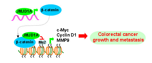 JMJD1A是一个组蛋白去甲基化酶,其能够特异性地去除H3K9二甲基化和单甲基化修饰。以往的研究表明JMJD1A在膀胱癌等多肿瘤中高表达并能促进肿瘤的发生发展,但其在结直肠癌发生发展中的作用仍不太清楚。俞春东教授课题组发现JMJD1A在人结直肠肿瘤样品中高表达并且与增殖细胞核抗原(PCNA)表达成正相关的。敲低JMJD1A可以减缓结直肠肿瘤细胞的增殖以及下调细胞周期相关基因c-Myc、Cyclin D1和PCNA的表达。敲低JMJD1A可以抑制小鼠移植瘤的生长。另外,敲低JMJD1A可以通过抑制基质金属肽酶9(MMP9)的表达和酶活性来抑制结直肠癌细胞的迁移、侵袭和肺转移。进一步的研究表明JMJD1A可以通过诱导β-catenin的表达以及与β-catenin结合募集到β-catenin靶基因的启动子上对H3K9me2去甲基化来增强Wnt/β-catenin靶基因的表达,进而促进结直肠肿瘤的生长和转移。