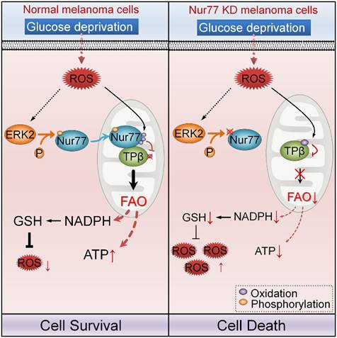 这项研究中,该团队首先发现Nur77对于黑色素瘤细胞适应葡萄糖饥饿的代谢应激状态至关重要。在葡萄糖饥饿下,Nur77可维持细胞内的NADPH及GSH的水平,从而降低葡萄糖饥饿引起的ROS,促进黑色素瘤细胞的存活。机制分析表明,葡萄糖饥饿可诱导ERK2的激活并磷酸化Nur77。磷酸化的Nur77被转运到线粒体,与执行脂肪酸氧化最后一步反应的硫解酶TPβ相互作用。TPβ在葡萄糖饥饿下会发生氧化修饰,从而抑制其酶活性,降低脂肪酸氧化。而当Nur77与TPβ结合后,由于Nur77自身对ROS介导的氧化修饰更敏感,Nur77以自我牺牲的方式保护TPβ免于氧化引起的失活。因而,Nur77与TPβ的结合促进脂肪酸氧化,从而维持NADPH、 GSH的水平,降低ROS,保证了细胞的存活。